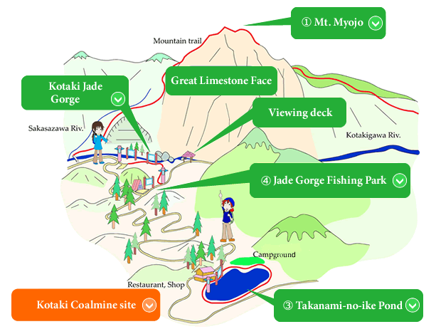 Nearby Takanami-no-ike Pond, produced by a landslide from Mt. Akahageyama, is said by locals to be the home of a giant fish they've named 'Namitaro.' Behind the pond are the remains of the Kotaki Coal Mine, which operated during the first half of the 20th century. The pond itself is a very popular space for camping, walking, picnicking, or just relaxing with family and friends. The nearby Jade Gorge Fishing Park also offers the opportunity to fish for common mountain stream fish like char and rainbow trout.