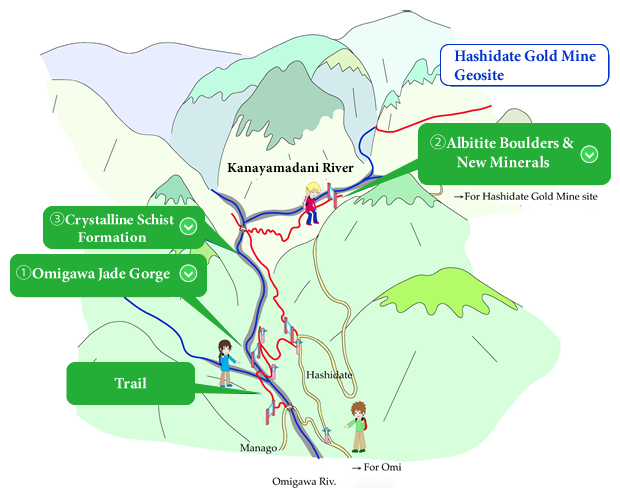 Large boulders of a mineral called albitite can be found in the upper reaches of the Kanayamadani River, a small tributary of the Omigawa River. Chemically, albitite is relatively similar to jade and they often are found in the same location. Because of this, jade was long thought to be formed from albitite subjected to extreme pressure, but recent evidence suggests this theory may not be correct.