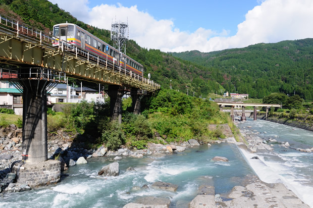 The Oito Line connects Itoigawa with the city of Matsumoto in Nagano Prefecture. It passes through a number of villages along the way as it winds through the mountains. As the line passes through the gorge, weaving back and forth across the Himekawa River, it almost seems to be stitching the mountains together, as if to mend the rift cut through the Alps by the swiftly flowing Himekawa. Although it was originally built this way out of necessity, the route it takes offers beautiful and unique views of the Himekawa Gorge, making it a popular scenic rail which offers access to a number of geosites. It is for this reason that it is also called "The Geopark Railroad."